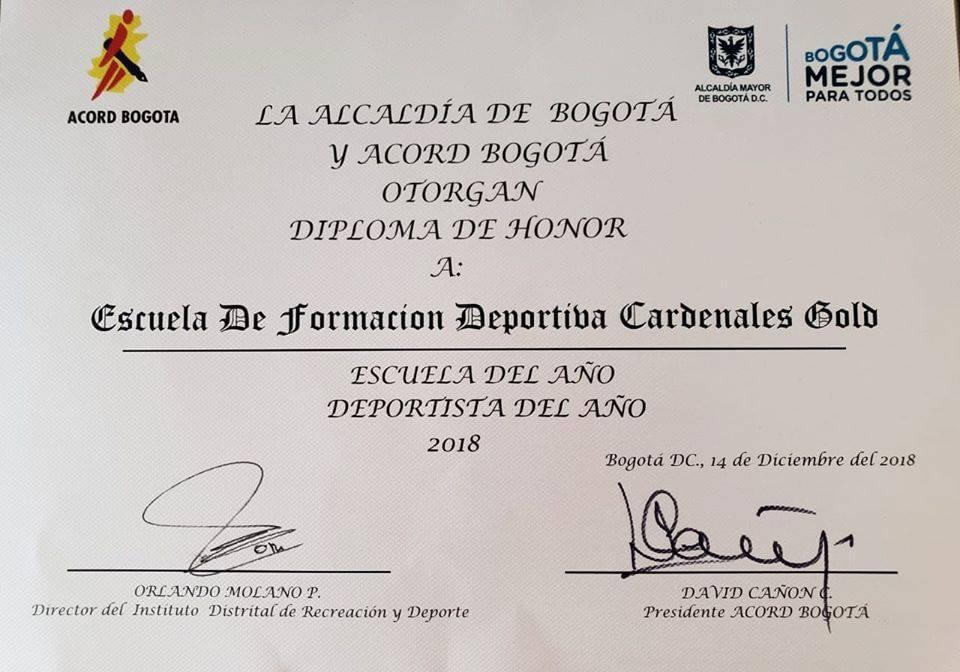 PREMIO I.D.R.D Y ACORD BOGOTÁ - MEJOR ESCUELA DEPORTIVA AÑO 2018